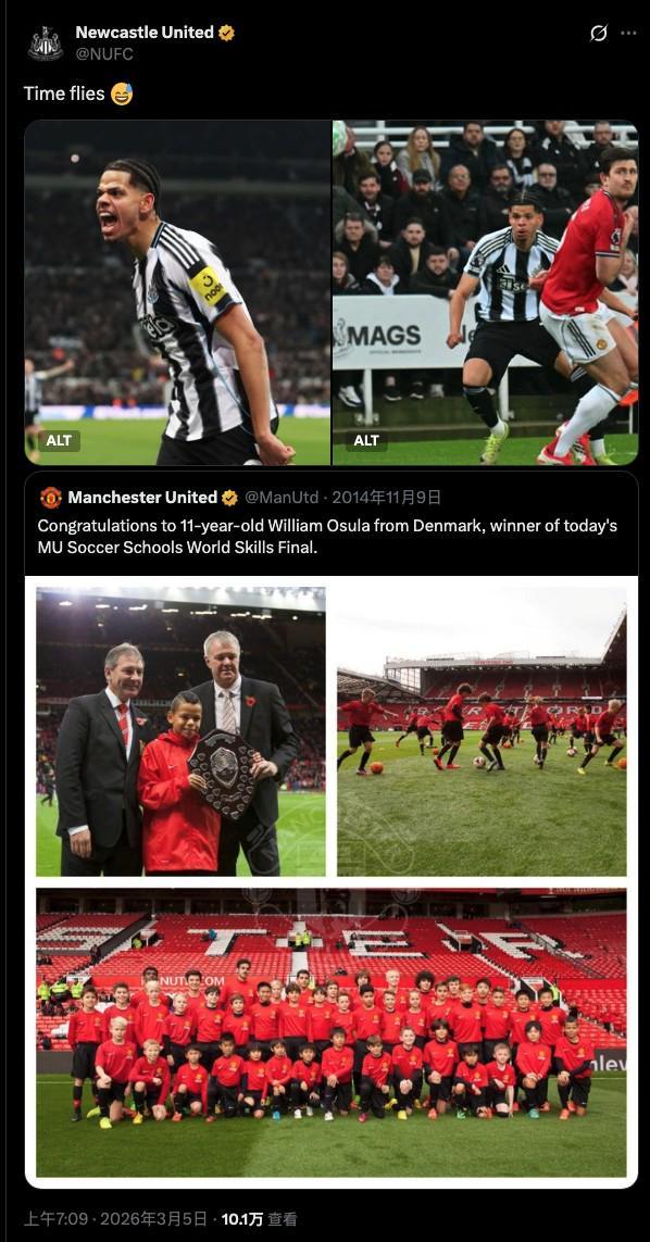 赛后,纽卡官方转发了曼联当年的帖子,并配文:“时光飞逝”
